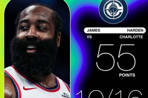 前三科詹库!哈登36岁89天砍下55分 成NBA历史第4老的55+先生